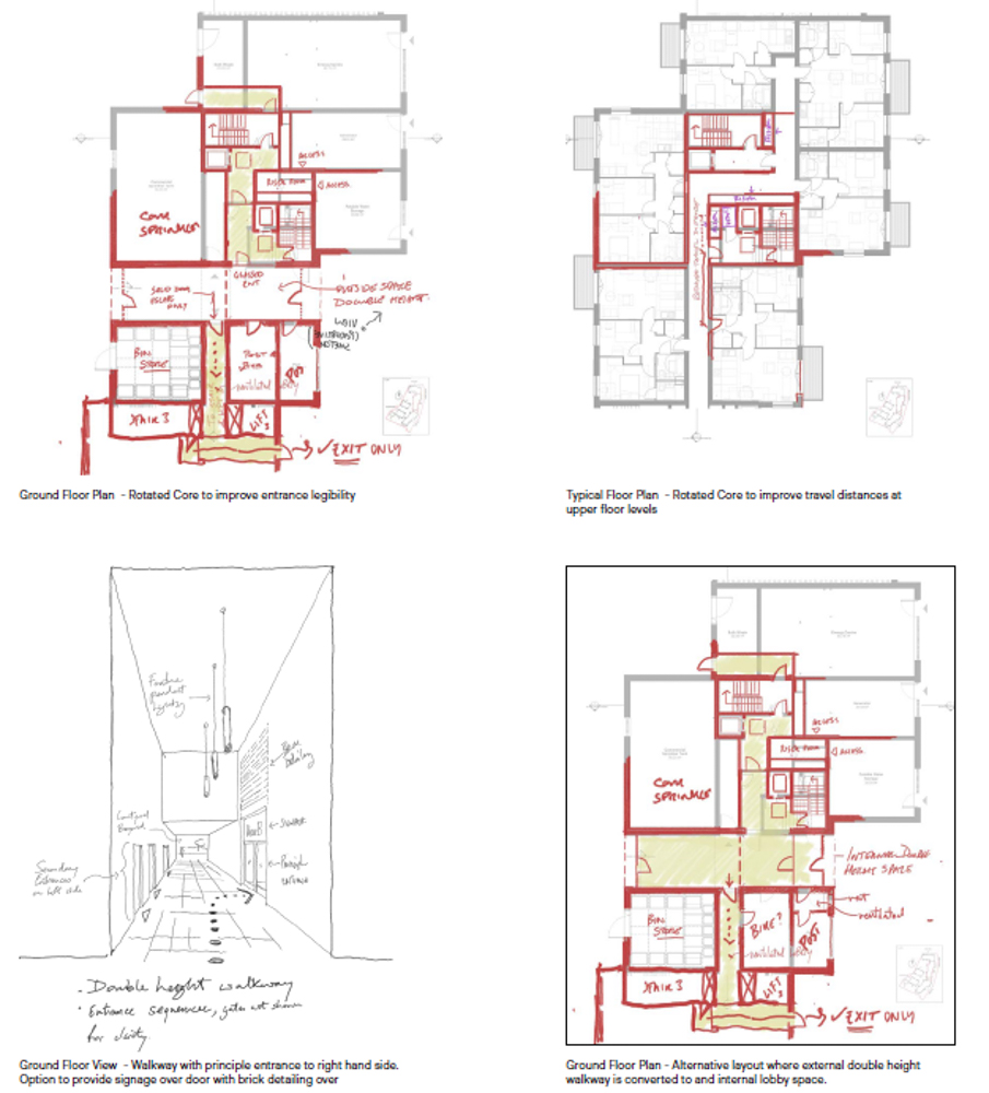 Cloister Corner / Royal gateway is a developed design taking over at the end of stage 3 from Allies and Morrison. The design suffered setbacks from the hasty inclusion of a 2nd staircase.